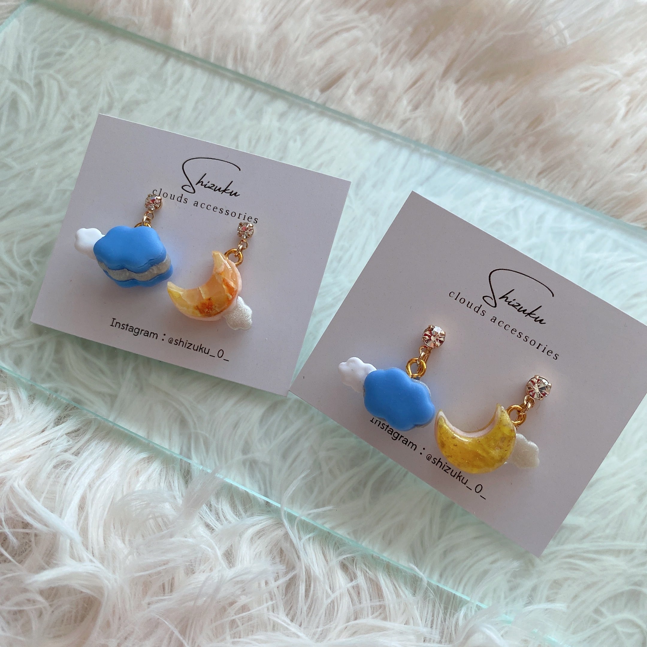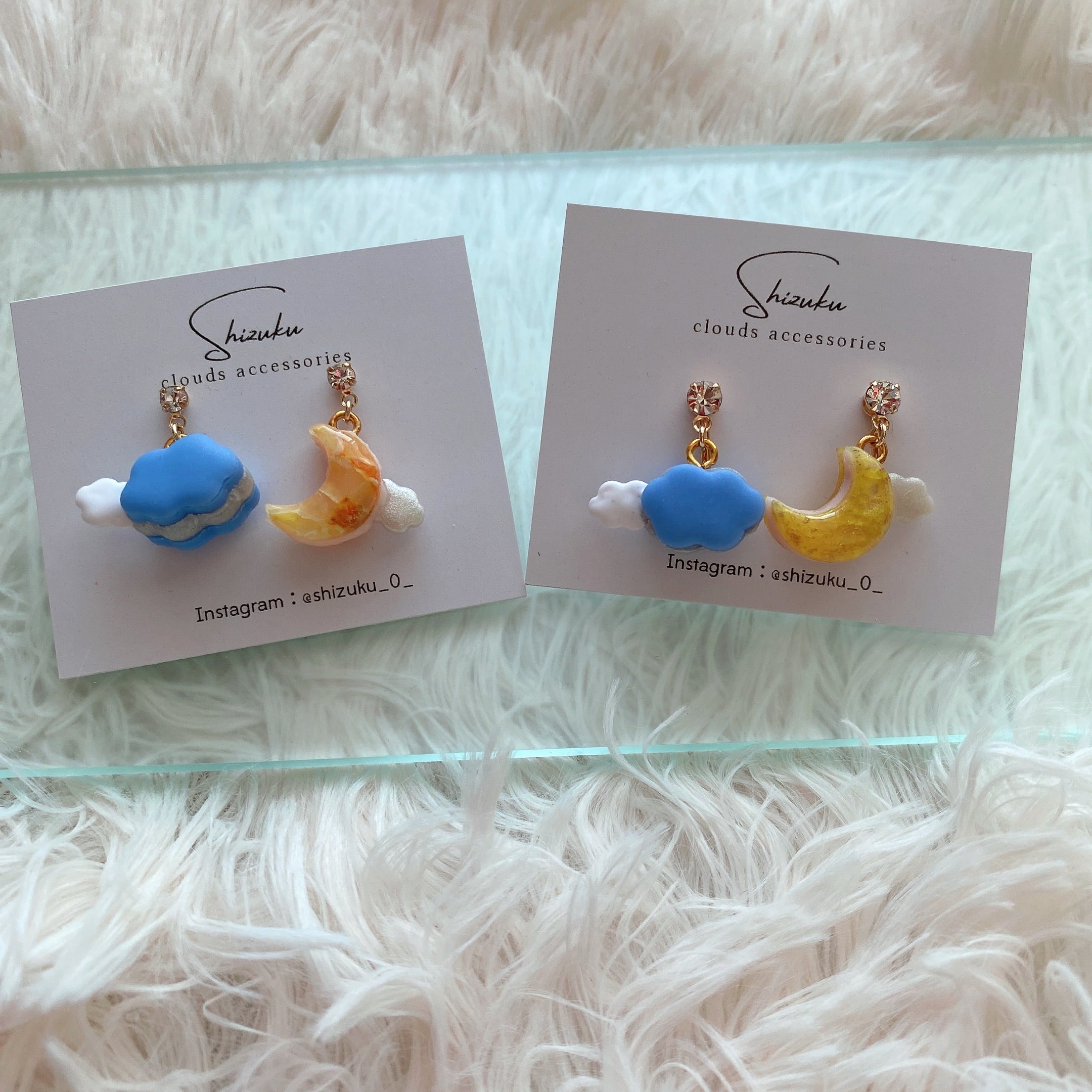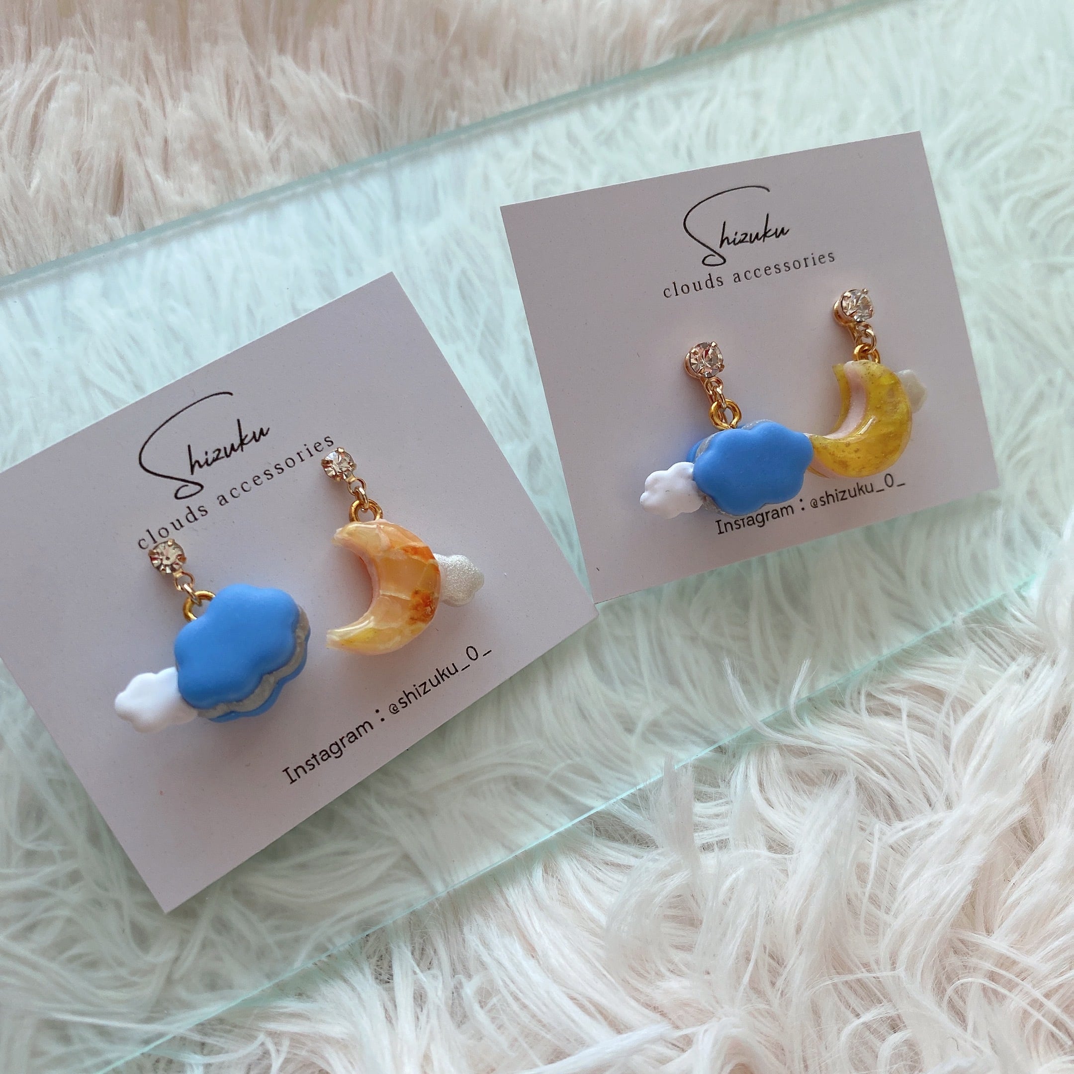 月の光に照らされた幻想的な三日月と、ふわふわの雲をテーマにしたアクセサリーです。柔らかなパステルカラーで表現された雲が優雅にデザインされています。